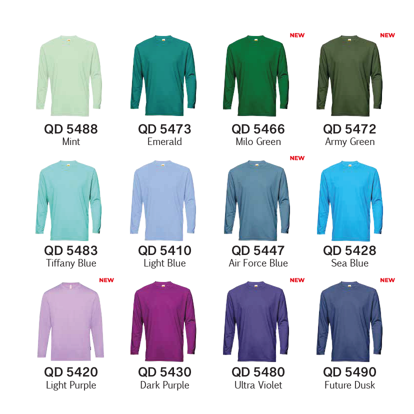 Sand, Caramel, Rose Dawn, Light Salmon, Neon Orange, Orange, Pink, Neon Pink, Neon Peach, Magenta, Red, Maroon, Yellow, Gold, Autumn, Neon Yellow, Neon Green, Lime Green, Mint, Emerald, Milo Green, Army Green, Olive, Forest Green, Tiffany Blue, Light Blue, Air Force Blue, Sea Blue, Royal, Slate Blue, Light Purple, Dark Purple, Ultra Violet, Future Dusk, Navy Pro, Navy, White, Light Grey, Dark Grey, Black
